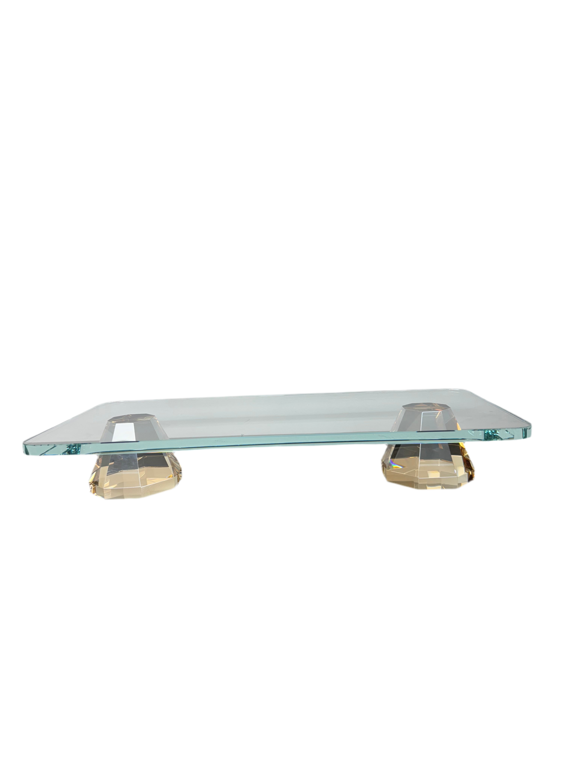 Expertly crafted, this Crystal Tray with Gold Ball Bottoms is the ideal accompaniment for your candlesticks. The elegant gold ball bottoms provide a secure base while the crystal tray adds a touch of sophistication to any setting. Make a statement with this beautiful and functional piece.