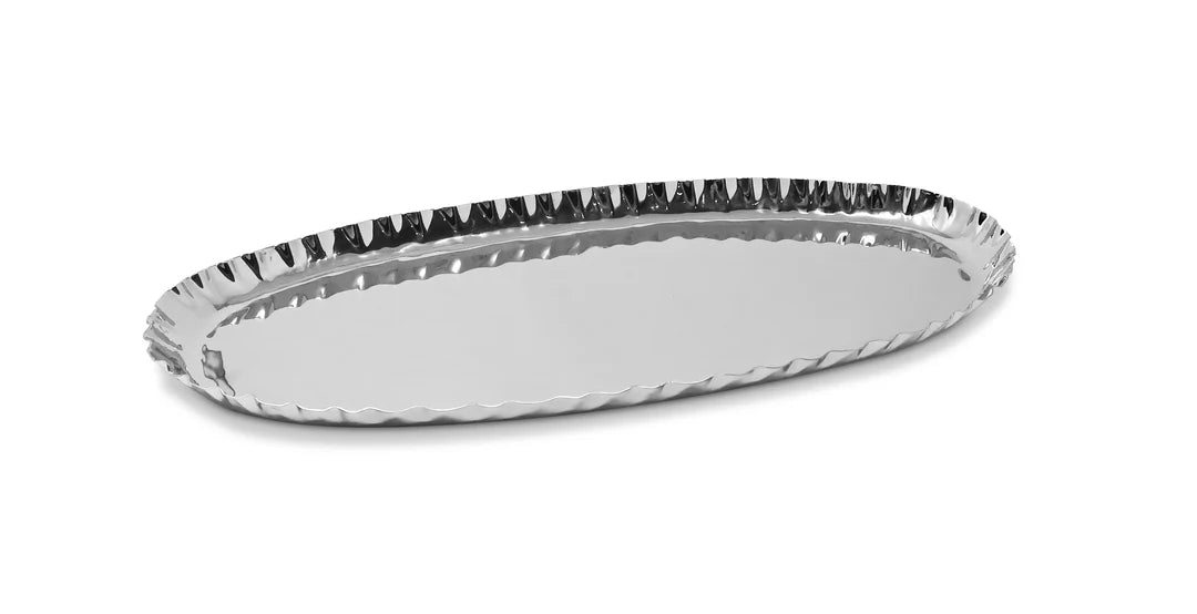 This 17.5" stainless steel crushed tray is an elegant choice for all your kitchen needs. It is perfect for serving meals or showcasing desserts. Its stainless steel construction offers durability and rust-resistance, so you can enjoy its polished shine for years to come. The crushed design adds to its stylish look.