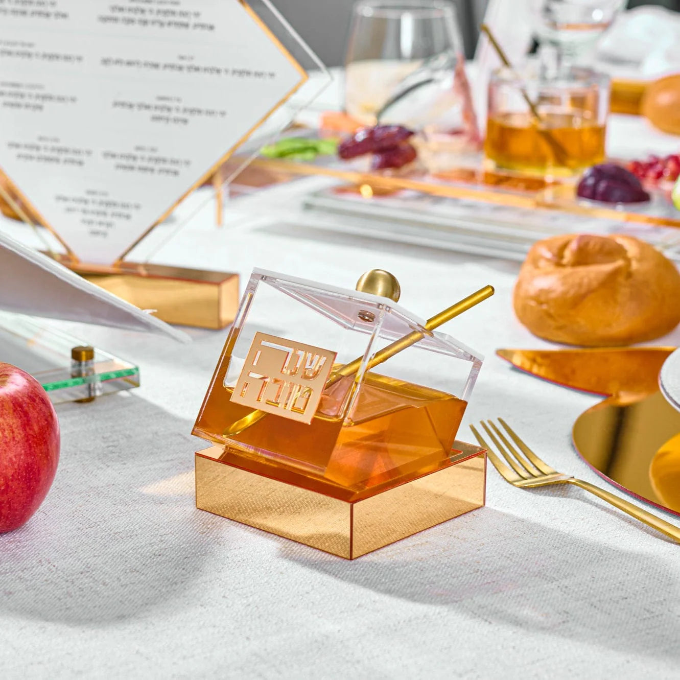 Bring a refined touch to your Rosh Hashanah table with this stunning Tilt Honey Dish, beautifully nestled in ametallic gold base. Designed for easy, mess-free dipping, it’s the perfect blend of form and function. The perfect way to display your honey!